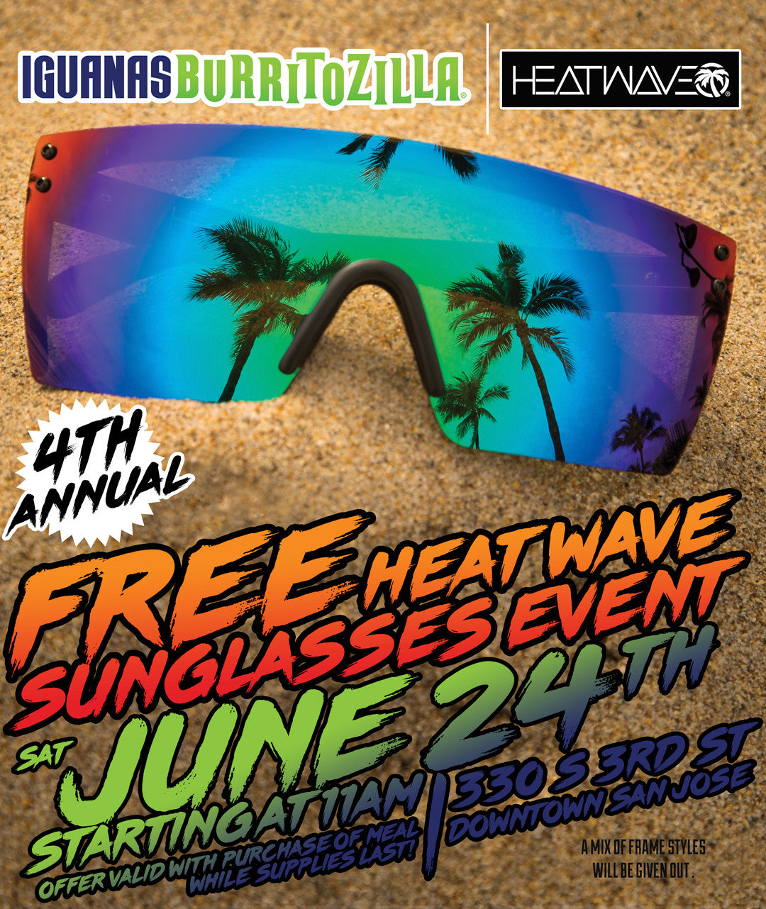 This event takes place exclusively at the Downtown San Jose Iguanas location Offer is valid between the hours of 11am- 2pm, or while supplies last - Get there early. Mix of frame styles will be given out.
